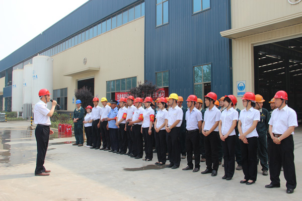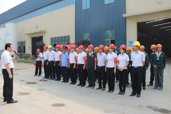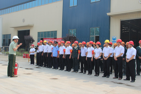 上午九時演習準時開始,因電線打火引發火災,經典集團西小件區,倉庫內有大量油漆,稀料以及大批橡膠制品等,形勢萬分緊急,車間及時報警,綜合辦接警后立即與消防大隊報警,然后車間員工及后勤各部門員工,按火災預定方案迅速組成指揮部,迅速“搶救人員,疏散物資”,先由4名隊員接通消防栓,迅速鋪設水帶,打開高壓水槍滅火,后由4名佩戴防毒面具隊員,用干粉滅火器滅火(撲滅零星小火),火勢全部撲滅后,指揮員下達“演習結束”命令,護衛隊清點物資裝備,列隊點名,兗州消防大隊房隊長做了點評,對我公司的應急演習做了高度評價。集團公司苗樹文董事長做了演習總結,杜福生總經理做了演習前動員講話,并陪同消防隊房隊長參觀了生產車間。