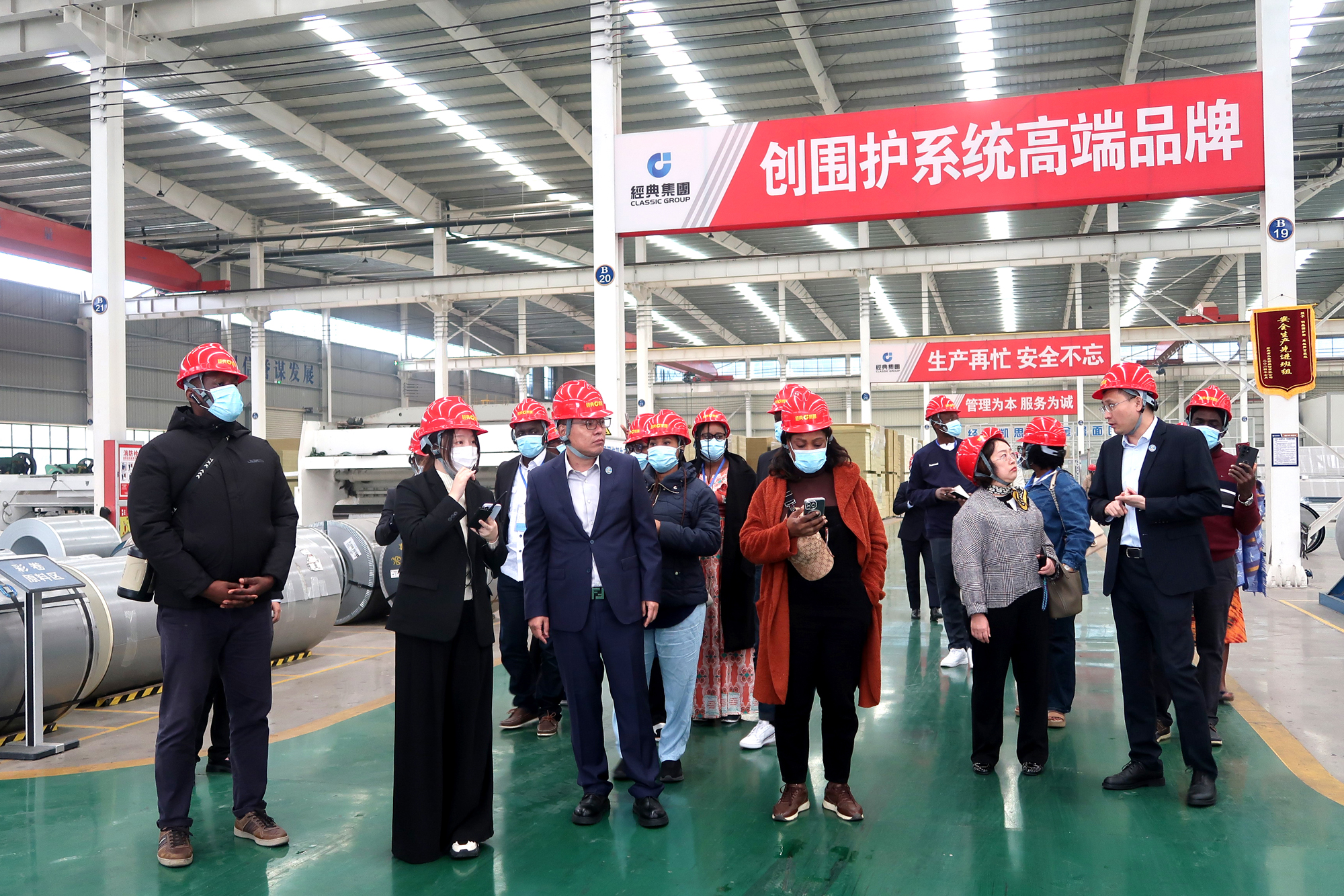 10月22日上午,商務部援外培訓項目“科特迪瓦中高級外交官研修班”一行20余人,在山東外貿職業學院國際官員研修學院院長王保紅帶隊下,蒞臨經典集團就工業發展經驗、中外經貿合作等方面的經驗做法進行參觀交流。經典集團副總經理兼生產總監張琦、副總經理侯士輝等陪同。